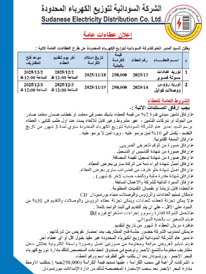 الشركة السودانية لتوزيع الكهرباء المحدودة Sudanese Electricity Distribution Co. Ltd إعلان عطاءات عامة