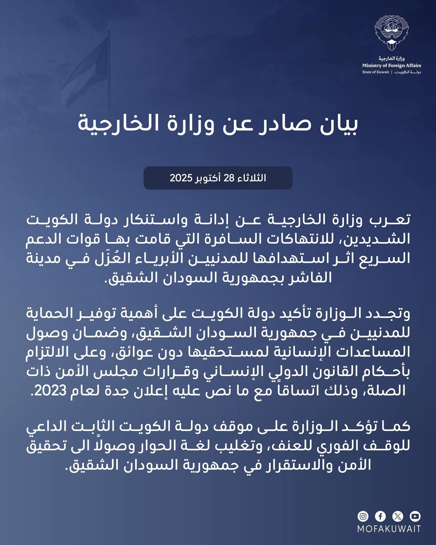 بيان صادر عن وزارة الخارجية الكويتية يدين الانتهاكات بالسودان